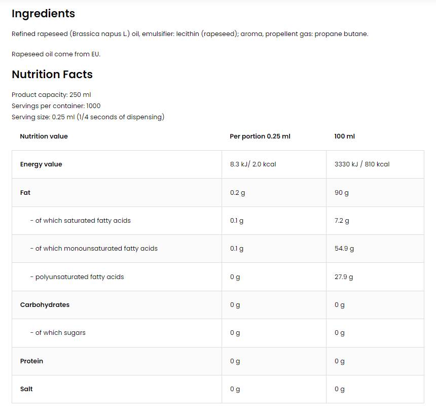 Научните изследвания показват, че замяната на традиционното масло със спрей за готвене може да помогне за намаляване на общия прием на калории, което е полезно за поддържане на здравословно телесно тегло. Освен това естествените съставки в спрея осигуряват по-здравословен начин за готвене без добавени вредни химикали.