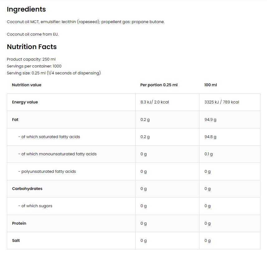 Кокосовият спрей за готвене е идеалното допълнение към всяка кухня. Формулата му позволява лесно и здравословно готвене без добавяне на ненужна мазнина. С него можете да приготвите вкусни ястия с минимално съдържание на калории, като същевременно добавите невероятен кокосов вкус. Този спрей е подходящ за печене, пържене и скара, което го прави универсален във вашата ежедневна готварска практика.