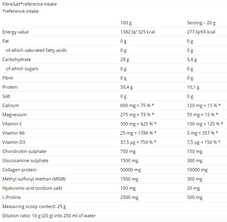 ФЛЕКСИТ Напитката съдържа глюкозамин, пролин, хондроитин, МСМ и хиалуронова киселина. Тя е и източник на колаген, протеин, обогатен с витамини C, B6 и D. Съдържа магнезий. Витамин C допринася за нормалното образуване на колаген и нормалната функция на костите и хрущялите. Витамин D поддържа нормални нива на калций в кръвта. МСМ участва в образуването на колаген.