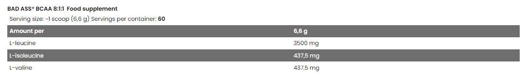 BAD ASS BCAA 8:1:1 предлага мощна комбинация от аминокиселини с разклонена верига с акцент върху левцина, който е ключов елемент за оптимално възстановяване и растеж на мускулите. Доказано е, че съотношението 8:1:1 (левцин:валин:изолевцин) активира анаболните механизми в тялото, което води до по-добри тренировъчни резултати и възстановяване.