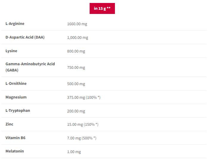 Съставът е сложен и включва: l-аргинин, DAA (d-аспарагинова киселина), лизин, GABA (гама-аминомаслена киселина), l-орнитин, магнезий, l-триптофан, цинк, витамин B6 и мелатонин Както виждате, съдържа всичко най-важно за постигане на желания ефект – дълбок и възстановяващ сън .