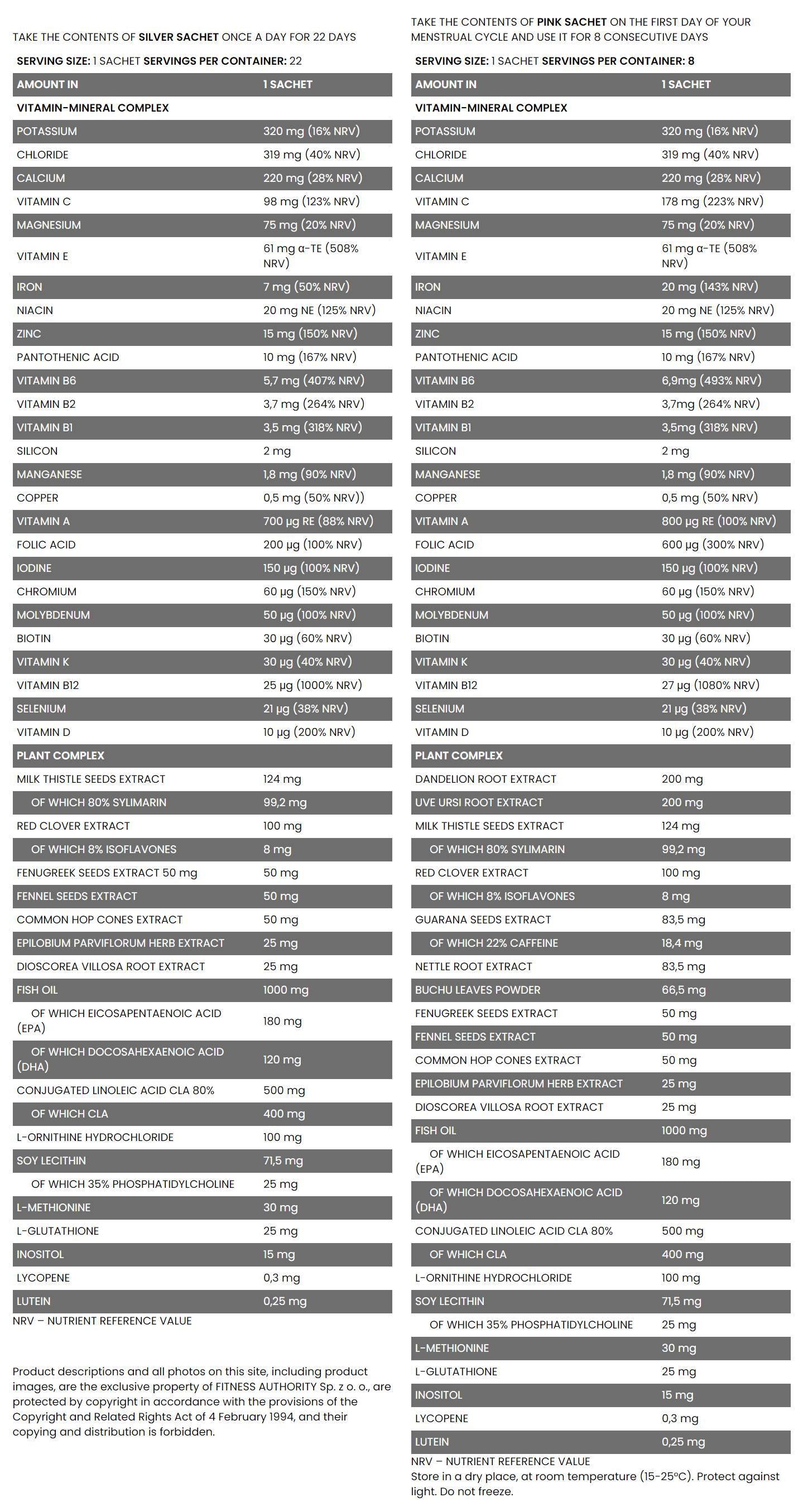 Пакетът съдържа 22 сребърни сашета и 8 розови сашета. Розовите сашета се приемат от първия ден на месечния цикъл на жената и се пият до края му или така 8 поредни дни. Сребърните пакетчета се вземат през останалите дни от месеца.