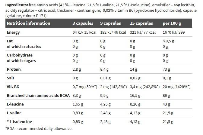 Всяка таблетка съдържа 1100 милиграма l-изолевцин, l-валин и l-левцин.