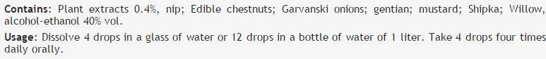Растителни екстракти 0,4%: хвощ; кестен; гарвански лук; тинтява; горчица; шипка; Уилоу