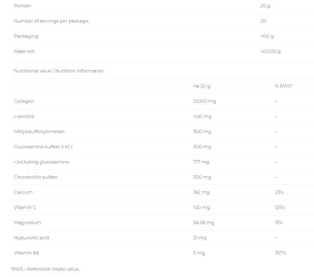 • Богато съдържание на активни съставки: Всяка порция съдържа колаген, глюкозамин, хондроитин, МСМ и хиалуронова киселина.