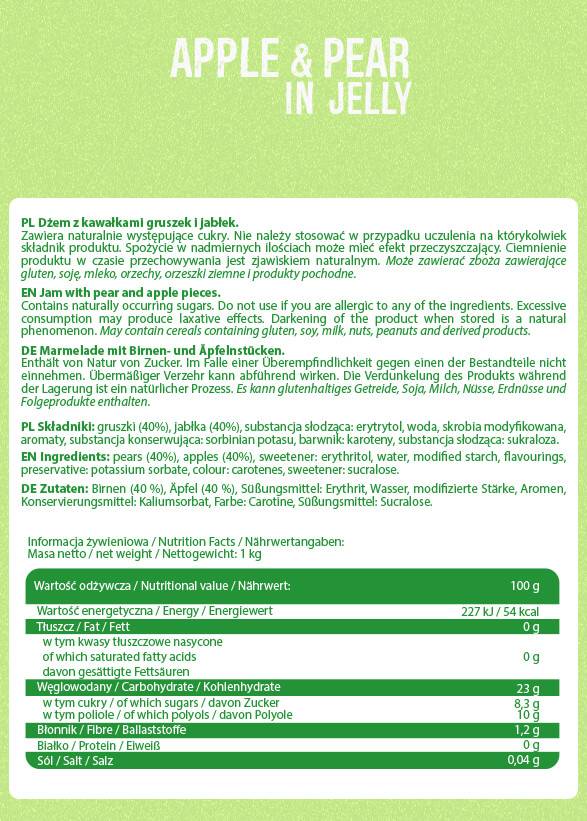 Желе с вкус на ябълка и круша е водещият продукт на марка номер едно за течни хранителни добавки. Този уникален продукт предлага множество ползи за здравето. Съдържащите се естествени съставки спомагат за подобряване на храносмилането, благодарение на високото съдържание на фибри. Фибрите не само подпомагат чревната перисталтика, но и спомагат за създаването на усещане за ситост.