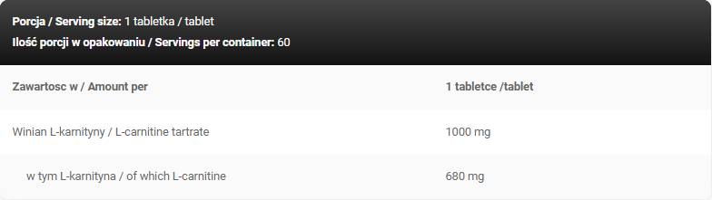 Състав: L-карнитин тартарат, антислепващи агенти (E341, E470b, E551).