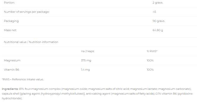 • Подходящ за активни хора: Магнезият е важен за правилния протеинов синтез, особено за физически активни индивиди.