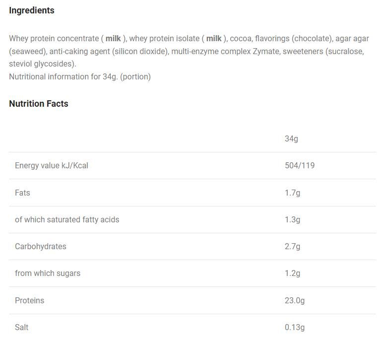 Суроватъчен протеин концентрат ( мляко ), суроватъчен протеин изолат ( мляко ), агар агар (водорасли), антислепващ агент (силициев диоксид), ароматизатори (ванилия), мултиензимен комплекс Zymate, подсладители (сукралоза, стевиол гликозиди), оцветители (бета каротин).