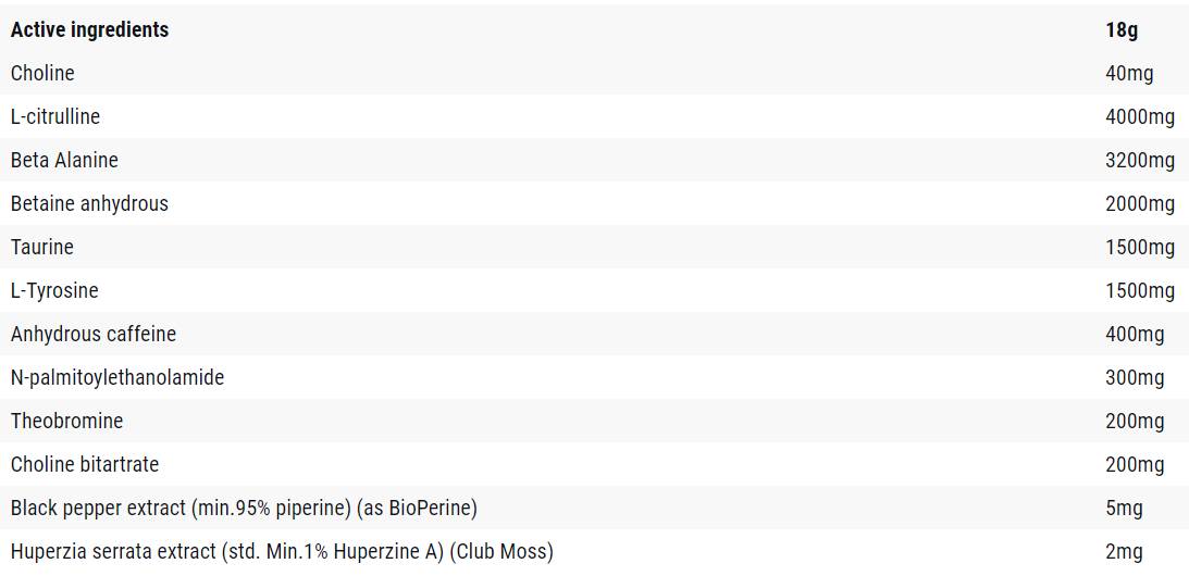 L-цитрулин: Неесенциална аминокиселина, която отдавна се използва в продуктите за предтренировъчна употреба, поради способността ѝ да подобрява производителността и да осигурява по-добро напомпване. Смята се, че цитрулин малатът има положителен ефект върху производството на АТФ и намаляването на млечната киселина, което води до повече енергия и по-добро възстановяване.
