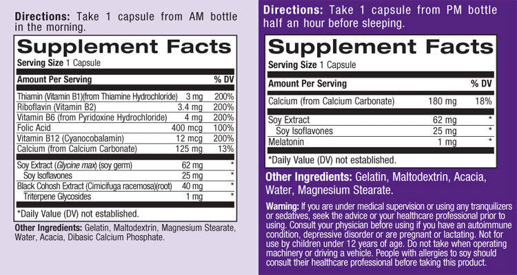Създаден да помогне за облекчаване на симптомите, свързани с менопаузата, Natrol Complete Balance® Menopause AM/PM съдържа соя, калций, черен кохош и витамини. Със своята специално разработена формула може да помогне за намаляване на горещи вълни, нощно изпотяване, промени в настроението и други симптоми на менопаузата.* Може също да помогне за балансиране на хормоните при жени в пременопауза*.