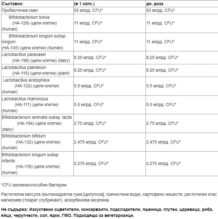 Critical Care Probiotic е патентована смес от 9 стомашно-стабилни щама с мощна концентрация от 55 милиарда активни клетки, които работят в синергия за максимална активност и ефикасност. Щамовете са бифидобактерии и лактобацили за целенасочена подкрепа както на тънките, така и на дебелите черва. Комплексът възстановява полезните бактерии, загубени при употреба на антибиотици, стрес, диета, пътуване и стомашно-чревни разстройства. Тази формула предлага значителна защита от бактериална инфекция, свръхрастеж на дрожди и храносмилателен дискомфорт. Патентованата синергична смес съдържа: Bifidobacterium breve, Bifidobacterium longum, Lactobacillus paracasei, Lactobacillus plantarum, Lactobacillus acidophilus, Lactobacillus rhamnosus, Bifidobacterium lactis, Bifidobacterium bifidum, Bifidobacterium infantis.