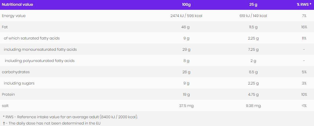 Предупреждение: Продуктът може да съдържа алергени. Не се препоръчва за хора с алергии към ядки. Консултирайте се с лекар преди употреба, ако имате здравословно заболяване или приемате лекарства.