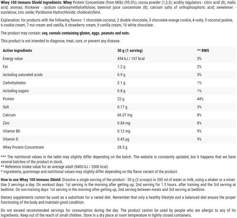 100% от съдържанието му е концентрат от суроватъчен протеин с чистота на концентрация над 80%. Суроватъчният протеин е сред най-популярните и ефективни протеини с естествен произход. Той има висока биологична стойност (BV104), много добра разтворимост и усвояване, както и значително количество аминокиселини с разклонена верига (BCAA) и глутамин.