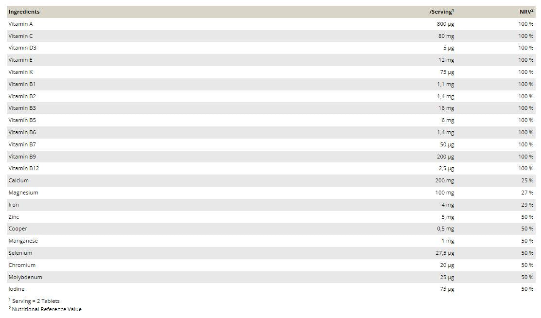 Всяка таблетка VITAMIN AZ ви осигурява комбинация от 28 основни витамини, минерали и микроелементи за вашето тяло. Таблетките са “освобождавани във времето”, т.е. те се доставят равномерно в тялото за период от часове и се усвояват или използват оптимално.