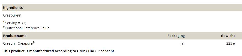 Creapure® се произвежда в Германия в съответствие с производствените насоки на фармацевтичната и хранително-вкусовата промишленост и следователно подлежи на най-строг контрол на качеството. Това води до висококачествен продукт с постоянно висока степен на чистота.