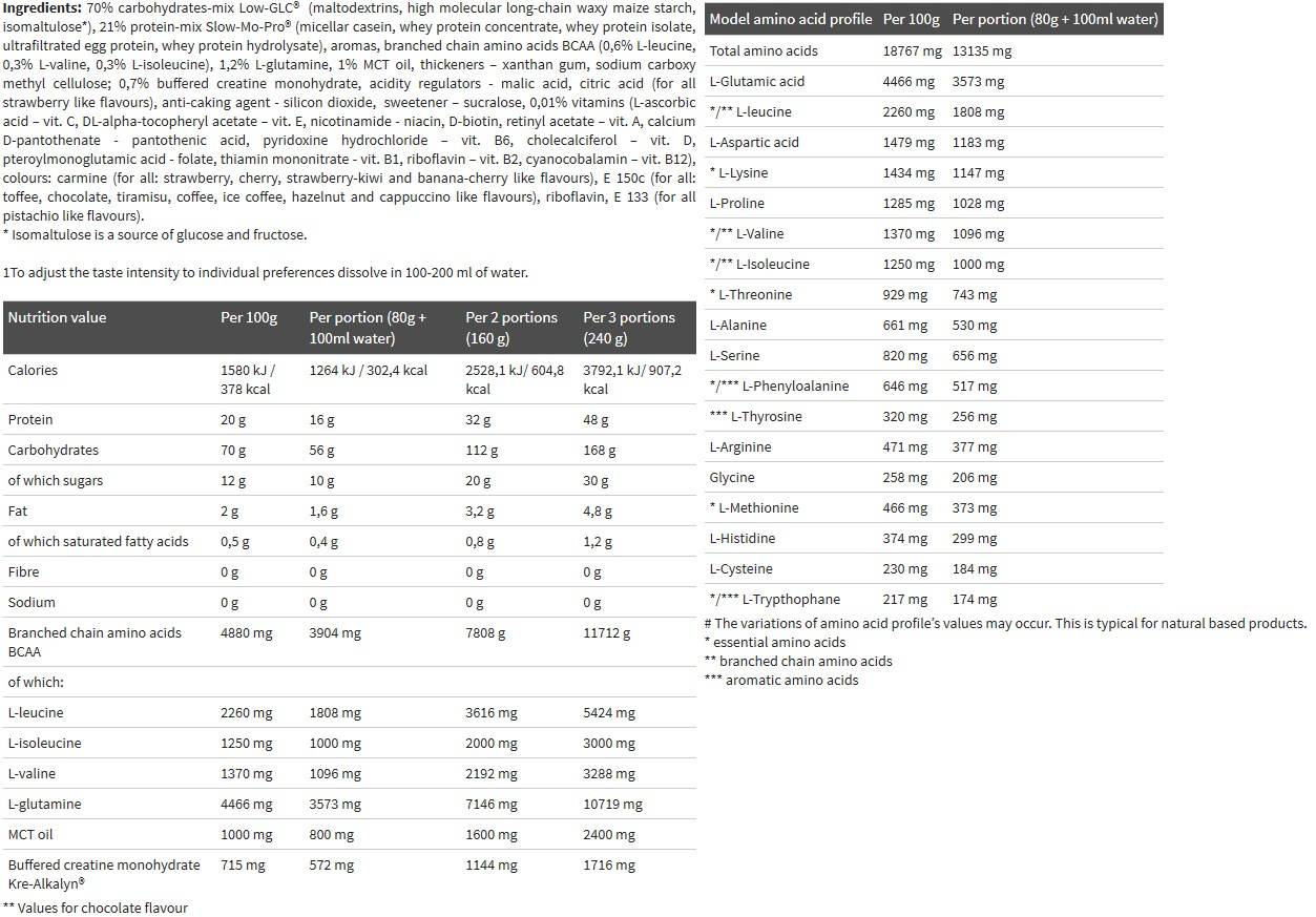 Въглехидратите с ниско съдържание на GLC™ осигуряват източник на енергия, започвайки само 30 минути след прием и продължавайки почти 4 часа. Приемът му след тренировка осигурява попълване на хранителни вещества за оптимизиране на процесите на възстановяване. Добавянето на MCT масло и буфериран креатин монохидрат ( Kre-Alkalyn® ) е насочена към подобряване и минимизиране на фазата на регенерация, така че растежът след тренировка да се осъществява без никакви пречки.