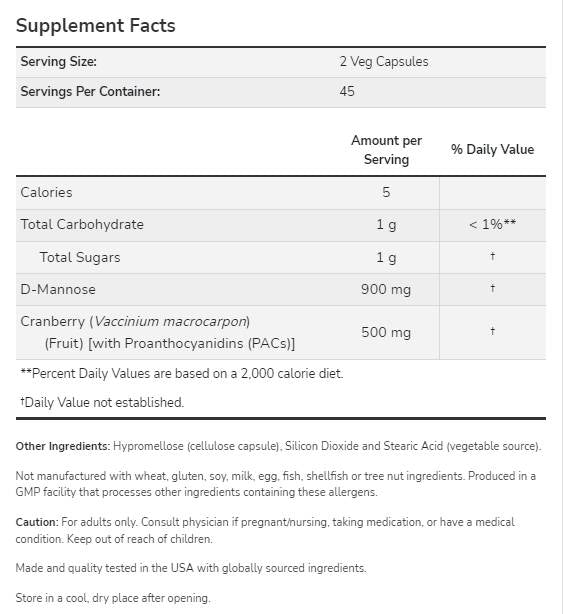 Предупреждения: Не се препоръчва за хора с известни алергии към боровинки или маноза. Консултирайте се с медицински специалист, преди да приемете този продукт, особено ако сте бременна, кърмите или имате предшестващо здравословно състояние.