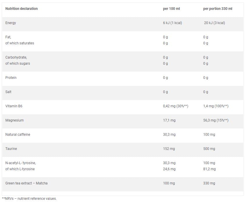 Съставки: Витамин B6, магнезий, кофеин, таурин, L-тирозин, екстракт от зелен чай мача